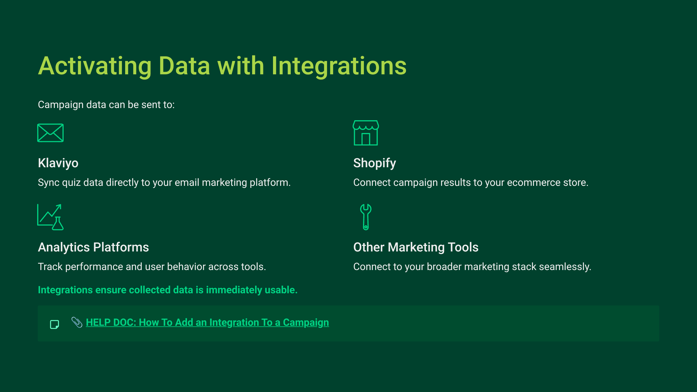 Digioh integrates with tools like Klaviyo, Shopify, analytics platforms, and advertising platforms so that the data collected in the experience becomes immediately usable.