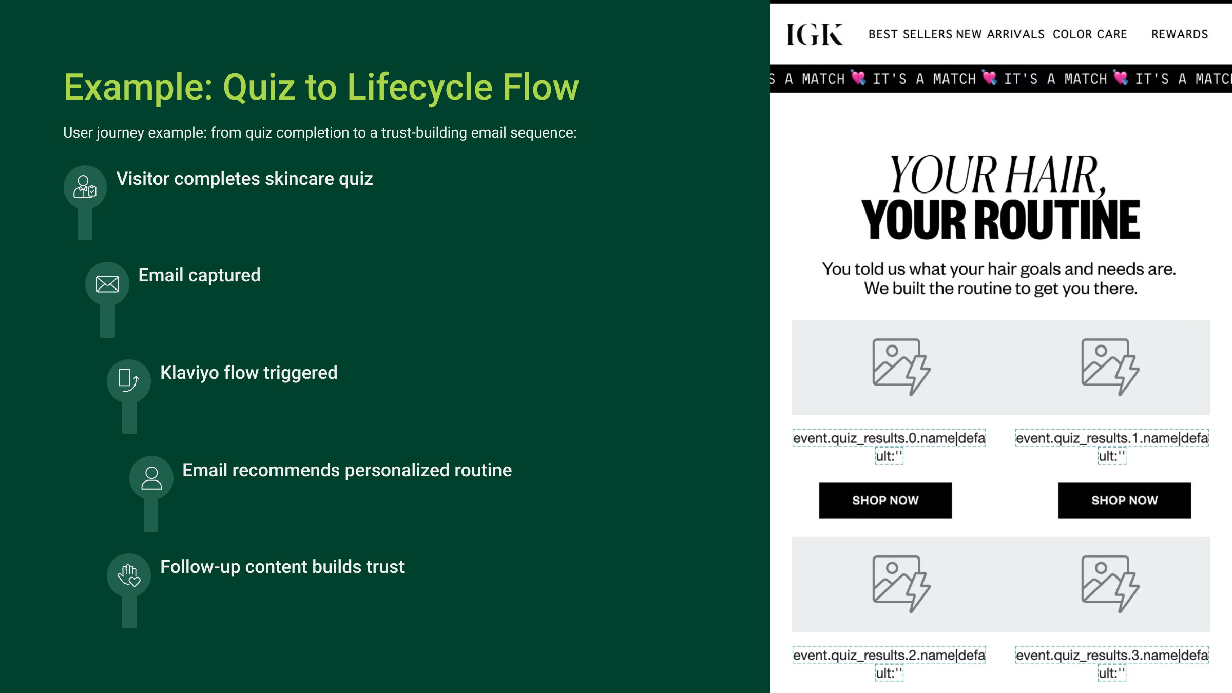 That information is sent to Klaviyo, which triggers an automated flow that delivers tailored product recommendations and educational content.